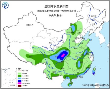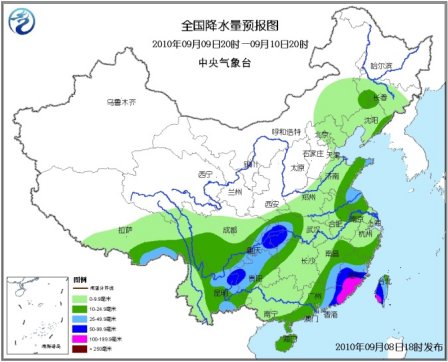 8日20時至9日20時,西藏中東部、青海南部、甘肅南部、寧夏南部、陜西、內(nèi)蒙古中部、華北大部、黃淮、江淮、江漢、江南大部、華南以及西南地區(qū)等地有小到中雨或陣雨,其中,四川盆地、川西高原中部、甘肅東南部、陜西南部、重慶西部和北部、福建東南部沿海、廣東中東部沿海、臺灣中南部等地有大雨或暴雨,四川盆地東北部局地有大暴雨;內(nèi)蒙古中部、山東半島東部、蘇皖中部、江西西部、廣西東南部、海南南部等地的部分地區(qū)有大雨;上述局部地區(qū)并伴有短時雷雨大風或冰雹等強對流天氣。新疆北部、甘肅西部、內(nèi)蒙古中西部和東南部等地有4~6級風。受10號熱帶風暴影響,臺灣海峽、臺灣以東洋面和以南海域、南海東北部有7~9級大風,風暴中心經(jīng)過的附近海域風力有10級,陣風11~12級;東海南部有5~7級東南風。黃海中北部有5~6級旋轉風;南海中部有5~6級西南風。