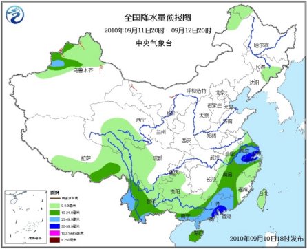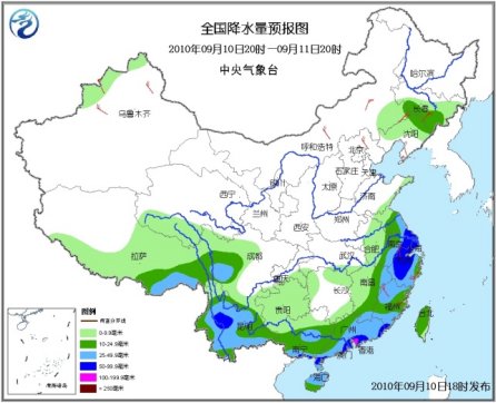 10日20時至11日20時,新疆西北部、青海南部、西藏中東部、內(nèi)蒙古東南部、東北中南部、山東東部、江淮中東部、江南大部、華南、四川西部、重慶東南部、貴州、云南等地有小到中雨或陣雨,其中,江蘇東部和南部、上海、安徽東南部、浙江大部、江西東北部和東南部、福建西北部和南部、廣東大部、廣西南部、海南中北部、云南大部、川西高原南部、西藏東南部等地有大雨或暴雨,局地有大暴雨;上述地區(qū)局部并伴有短時雷雨大風(fēng)或冰雹等強對流天氣。新疆北部、內(nèi)蒙古東部、東北南部、華北東北部等地有4~5級風(fēng)。黃海南部海域有5~6級西南風(fēng)增大到7~8級的旋轉(zhuǎn)風(fēng),陣風(fēng)可達(dá)9~10級;東海西部海域、臺灣海峽有7~8級偏南風(fēng),陣風(fēng)可達(dá)9~10級;南海東北部海域、臺灣以東洋面和以南海域有5~7級西南風(fēng);黃海中部海域?qū)⒂?~6級東北風(fēng)。