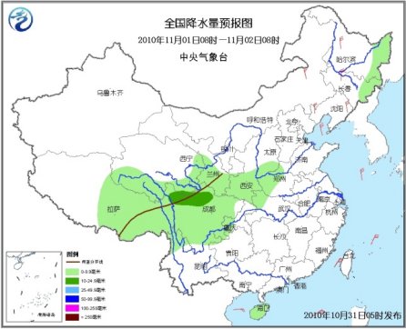 11月1日08時至2日08時,青海南部、西藏中東部、甘肅南部、川西高原北部、黑龍江東部、吉林東部等地的部分地區(qū)有小到中雨(雪)或雨夾雪;陜西南部、山西南部、河南西部、湖北西北部、四川大部、重慶西南部、云南北部以及海南等地有小雨或陣雨。內(nèi)蒙古東部、東北等地有4~6級風。臺灣海峽、臺灣以東洋面和以南海域、南海東北部和中部海域?qū)⒂?~8級、陣風9級的東北風。另外,受另一股冷空氣影響,渤海、黃海北部和中部海域?qū)⒂?~7級、陣風8級的偏北風。