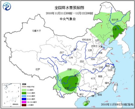 11日08時(shí)至12日08時(shí),內(nèi)蒙古東部、東北地區(qū)有小到中雪,其中東北地區(qū)南部的部分地區(qū)有大到暴雪;西南地區(qū)東部有小到中雨;華北、東北等地有4-5級(jí)風(fēng)。