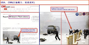 其一是“以偏概全,混淆視聽”。3月17日,CNN和法新社在各自網(wǎng)站上使用了同一張圖片,圖中兩輛綠色卡車一前一后正向兩名平民駛來——事實上,如果完整展示圖片的話,可以看到當(dāng)時軍車旁有約10名暴徒在向軍車投擲石塊,雖然CNN網(wǎng)站的圖片說明寫的是“藏人向軍車投擲石塊”,但圖中卻看不見這一已被裁去的場景。