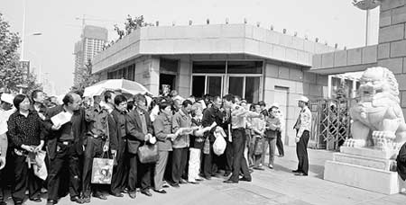 與兩年前一樣,昨天早上7時,記者在現(xiàn)場看到,省法院大門口向西,來訪群眾已自覺排起了200多米的長隊,手里都拿著一份份文書材料!拔以诜ㄔ洪T口呆了一夜,掂著早餐也吃不下去!64歲的范淑珍提著行李和早餐站在門口。為了早點見到省法院的領(lǐng)導(dǎo),4日上午,她就從鞏義來到鄭州,早早在省法院門口排隊。新鄉(xiāng)的郭秀香也是提前一天來鄭州,排了一晚上隊。