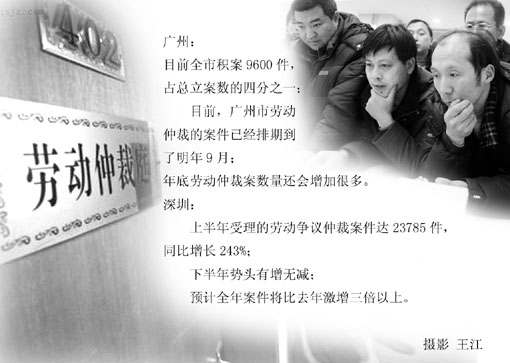 記者了解到,深圳市勞動(dòng)爭(zhēng)議仲裁院同樣面臨著勞動(dòng)仲裁案件“井噴”的問題。該院負(fù)責(zé)人告訴記者,上半年他們受理的仲裁案件達(dá)到了23785宗,同比增長(zhǎng)了243%,下半年勢(shì)頭有增無(wú)減,預(yù)計(jì)全年的案件將比去年激增三倍以上。