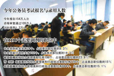 在7555個職位中,共有1196個職位沒有合格人選,或者合格人選未達到規(guī)定面試比例,其中有586個職位報考人數(shù)本身就未達到規(guī)定的面試比例,甚至無人報考。主管部門分析發(fā)現(xiàn),這些職位主要是艱苦、邊遠、基層職位和專業(yè)特殊的職位,也有部分職位是由于設(shè)置不合理的資格條件,導(dǎo)致報考人員和過線人員較少。
