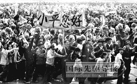 不遠(yuǎn)處,坐在木頭臨時(shí)搭建的臺(tái)子上,3000名日本青年也看得目瞪口呆,他們和中國(guó)觀眾一起歡呼著,跳躍著,沒(méi)有人愿意離開(kāi)位置半步,生怕錯(cuò)過(guò)任何一個(gè)歷史鏡頭。突然,在群眾方隊(duì)中,幾名北大生物系學(xué)生拉出了一條由床單做成的橫幅,綠色大紙上寫著:“小平您好!”四個(gè)大字。這是一個(gè)未經(jīng)審定的標(biāo)語(yǔ),幾名便衣準(zhǔn)備上前搶奪,但還沒(méi)來(lái)得及行動(dòng),全場(chǎng)已經(jīng)沸騰了起來(lái)。