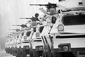 車隊(duì)啟動(dòng)了。一路上,沿途不斷傳來(lái)槍聲和爆炸聲,伊拉克警察和美軍車隊(duì)不時(shí)從身邊疾馳而過(guò)。席栓柱和戰(zhàn)友們?cè)谲噧?nèi)頭戴鋼盔、身穿防彈衣,手指頭一刻也不離開扳機(jī),眼睛全神貫注地搜索著窗外每一個(gè)可疑情況。