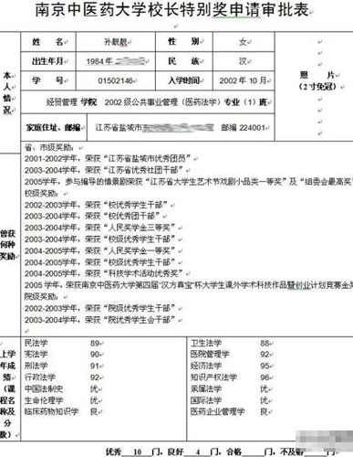 通過網(wǎng)上一份“南京中醫(yī)藥大學(xué)校長特別獎申請審批表”里可以看出,孫靚靚是一個各方面都很出色的學(xué)生。她從2002年起每個學(xué)年都是校級或院級的優(yōu)秀學(xué)生干部。大學(xué)期間品德方面、學(xué)習(xí)方面、實踐方面等方面的都很優(yōu)秀。依據(jù)這份申請表,孫靚靚是個積極參與社會活動,同時也是個學(xué)習(xí)、生活等都很踏實的人,因此時常拿到獎學(xué)金,還參與編導(dǎo)及演出的該校首部校園DV電影《那一年的青澀》很受好評。