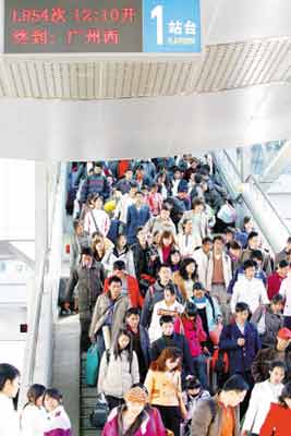 昨日上午10點半左右,昆明站已是人山人海,放眼望去,攜老扶幼、挎滿大包小包行囊的乘客正在秩序井然地通過安檢。“昨天乘客還少很多,但今天一早開始,就明顯多了起來。和去年一樣,今年春節(jié)長假的客流回升期依然集中在初六、初七這兩天!敝蛋嗾鹃L向婭說,昆明站春運期間臨時增設(shè)了車票大賣場,現(xiàn)在至廣州、廈門的臥鋪票每天早上8點以前基本就售完。而為了應(yīng)對節(jié)后的客運高峰,昨日增開了4趟省際、城際列車,分別發(fā)往廣州西、上海以及曲靖。