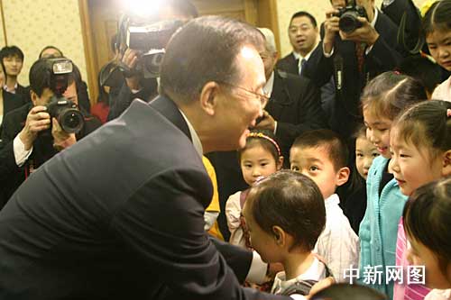當(dāng)?shù)貢r(shí)間二月一日中午,正在訪英的中國總理溫家寶來到使館看望中國駐英外交官和華僑華人。一群衣著鮮艷的孩子向溫家寶獻(xiàn)上鮮花,并齊聲朗誦溫家寶的詩作《仰望星空》。溫家寶親熱地探下身與孩子們問好。中新社記者 張朔攝