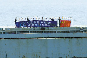 下午2點(diǎn)30分許,兩艘脫離危險(xiǎn)的中國商船與“武漢”艦在亞丁灣某海域會(huì)合。此后,他們將在“武漢”艦的伴隨護(hù)航下,安全駛向下一個(gè)目的地港口。經(jīng)歷了凌晨的驚心動(dòng)魄,在茫茫無垠的大海上見到自己祖國的軍艦,兩艘商船上的船員再也掩飾不住興奮和喜悅!吧徎ê!碧(hào)船員放起了鞭炮,“樂民”號(hào)船員高舉鮮紅的五星紅旗,并打出了“中遠(yuǎn)航運(yùn)歡迎您!”表達(dá)他們對祖國海軍的真摯謝意。(田源 錢曉虎)