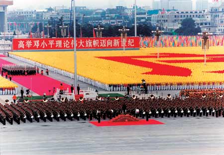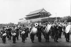 1950年10月1日,中國人民迎來了共和國的第一個(gè)生日。500名軍樂隊(duì)員在廣場上站立演奏了好幾個(gè)小時(shí)之后,在總指揮晨耕的指揮下,邁著矯健、整齊的步伐,演奏著激揚(yáng)、堅(jiān)定的《中國人民解放軍進(jìn)行曲》,最后行進(jìn)通過天安門廣場,接受毛主席檢閱。望著一排排朝氣蓬勃的軍樂戰(zhàn)士,毛澤東主席高興地頻頻揮手,高喊:“人民萬歲!軍樂團(tuán)萬歲!”隨后轉(zhuǎn)過身來對聶榮臻說:“我們中國這么大,人口這么多,要成立千人軍樂團(tuán)。”