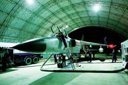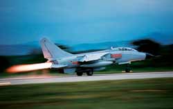 “1號請求起飛!薄鞍从媱潏(zhí)行。”一切準備就緒后,塔臺指揮員干凈利索地下達了命令。18時25分,該團團長李軍第一個駕駛“飛豹”戰(zhàn)機沖向跑道。頓時,機場上響起巨大轟鳴聲,震得記者耳朵嗡嗡作響;,加力,起飛,戰(zhàn)鷹閃著亮光騰空而起,噴著橘紅色的尾焰直沖蒼穹,最后消失在茫茫夜色之中。
