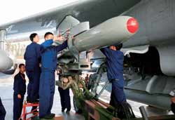 信號彈劃過,剛剛還顯得靜謐的機場立刻忙碌起來。借助微弱的燈光,記者看到空勤人員一身戎裝迅速就位,地勤人員有條不紊地檢查著“飛豹”戰(zhàn)機;機場車燈閃爍,各種保障車輛忙而不亂,為戰(zhàn)鷹加油、充電、充氧、掛彈;3輛燈車朝著跑道頂頭駛?cè)ァ?table border=0 cellspacing=0 cellpadding=0 align=left>