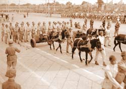 他說,當(dāng)時(shí)炮兵方隊(duì)是第四個(gè)通過天安門廣場的隊(duì)伍,以輕迫擊炮、重迫擊炮、戰(zhàn)防炮、山炮和野炮、榴彈炮、高射炮等7種上百門火炮陣容出現(xiàn)。火炮由小到大,由低到高,依次前進(jìn),有的火炮是用騾馬拽著通過天安門的。