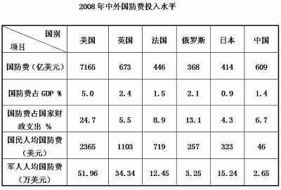 首先,應(yīng)當(dāng)看到中國(guó)國(guó)防費(fèi)的投入是適度有限的。近年來(lái),中國(guó)的國(guó)防費(fèi)有了較大幅度的增長(zhǎng),似乎中國(guó)的國(guó)防費(fèi)已經(jīng)很多了,但如果以歷史的、聯(lián)系的,而不是以孤立的、片面的觀點(diǎn),來(lái)審視和分析中國(guó)的國(guó)防費(fèi)問題,就會(huì)得出一個(gè)中國(guó)的國(guó)防費(fèi)投入實(shí)際上并不多的客觀結(jié)論。從歷史上看,中國(guó)國(guó)防費(fèi)投入的增長(zhǎng)帶有明顯的補(bǔ)償性。根據(jù)國(guó)家統(tǒng)計(jì)局有關(guān)公開資料,從1979年到1989年,國(guó)防費(fèi)平均增長(zhǎng)為1.23%,與同期居民消費(fèi)價(jià)格總指數(shù)平均上漲7.49%相比,實(shí)際年平均負(fù)增長(zhǎng)超過6%。從1990年到1997年國(guó)防費(fèi)年均增長(zhǎng)15.8%,而同期居民消費(fèi)價(jià)格總指數(shù)平均上漲9.7%,中國(guó)國(guó)防費(fèi)排除物價(jià)因素后實(shí)際年均增長(zhǎng)只有6.1%。直到1998年國(guó)家物價(jià)指數(shù)比較平穩(wěn)之后,為降低長(zhǎng)期經(jīng)費(fèi)不足給國(guó)防和軍隊(duì)建設(shè)帶來(lái)的影響,國(guó)防費(fèi)投入才逐步有了較大幅度的實(shí)際增長(zhǎng)。在長(zhǎng)達(dá)10多年的“忍耐”過程中,中國(guó)國(guó)防和軍隊(duì)建設(shè)因經(jīng)費(fèi)不足而受到很大影響。從中國(guó)自身的情況看,中國(guó)國(guó)防費(fèi)的支出也是極其有限的。以這次兩會(huì)公布的有關(guān)數(shù)字為例,2009年中國(guó)國(guó)防費(fèi)預(yù)算比上一年度執(zhí)行數(shù)增加了14.9%,占全國(guó)財(cái)政支出預(yù)算的6.3%,與前幾年相比,所占比重略有下降,而同期教育費(fèi)增長(zhǎng)22.5%、醫(yī)療衛(wèi)生費(fèi)增長(zhǎng)20.9%、社會(huì)保障和就業(yè)費(fèi)增長(zhǎng)23.1%、環(huán)境保護(hù)費(fèi)增長(zhǎng)22.3%、保障性安居工程經(jīng)費(fèi)增長(zhǎng)199.6%,可見國(guó)防費(fèi)的增長(zhǎng)在各項(xiàng)社會(huì)事業(yè)費(fèi)的增長(zhǎng)中是相對(duì)偏低的,中國(guó)始終堅(jiān)持把主要的財(cái)力用于改善民生。再?gòu)膰?guó)際上看,中國(guó)與美、英、法、俄、日等西方國(guó)家相比,無(wú)論是國(guó)防費(fèi)占國(guó)家國(guó)內(nèi)生產(chǎn)總值(GDP)的比重(%)還是占國(guó)家財(cái)政支出的比重,無(wú)論是國(guó)民人均國(guó)防費(fèi)還是軍人人均國(guó)防費(fèi)投入等主要指標(biāo)都是比較低的(如下表所示)。