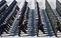 時間定格在1984年10月1日,首都北京,天安門廣場?扇菁{50萬人的世界第一大廣場上,人山人海,紅旗招展。9點40分,黨和國家領(lǐng)導人登上天安門城樓。10點整,閱兵式開始。真正考驗我的時刻到了!鄧小平主席講話完畢,雄壯的《義勇軍進行曲》響起,我將火紅的“八一”軍旗高擎在手中,正步走上天安門廣場,引導受閱大軍氣勢磅礴地通過天安門。天安門廣場由東到西743.25米,我踏著軍樂的節(jié)奏,按照每分鐘112步、每步75厘米的標準步幅,用時8分33秒、991步,分毫不差地落在了禮畢線上。方隊縱、橫、斜三線分明,踢腿帶風,足音如鼓,新聞媒體以“山的雄姿、海的壯闊”對儀仗方隊進行了報道。