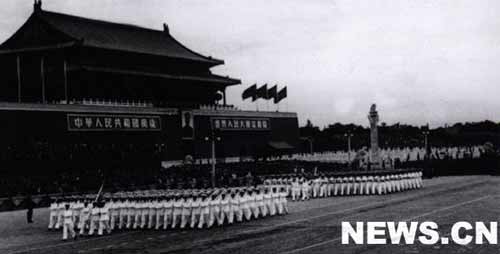 保衛(wèi)著祖國(guó)領(lǐng)海的水兵們,通過(guò)廣場(chǎng)后,百倍警惕地保衛(wèi)著社會(huì)主義建設(shè)的中國(guó)人民解放軍公安軍繼續(xù)行進(jìn)。