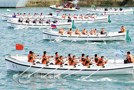 比賽在蔚藍的海上舉行,116艦的官兵們身著白色的海軍服列隊站在軍艦上觀看比賽。第一組共七支代表隊的隊員們奮力劃槳,白色的舢板逐漸劃向遠處,宛如7只白色的海鷗貼著海面飛翔。站在記者身邊的印度“孟買”號軍艦的一位機電業(yè)務長說:“舢板比賽是一種最能體現(xiàn)合作精神的競技項目,大家齊心協(xié)力才能劃得快。今天的比賽是一個很好的紐帶,世界的海軍官兵們可以通過它建立友誼!”