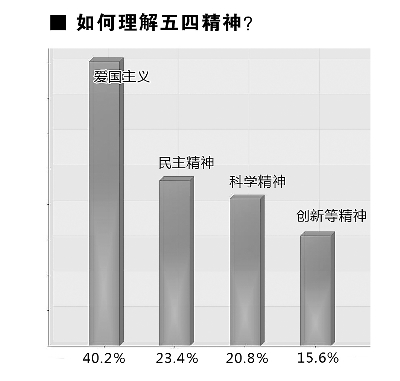 在對于五四精神的理解上,40.2%的受訪者選擇了“愛國主義”,認為這是五四精神中首先需要傳承的精神遺產(chǎn),23.4%選擇“民主精神”,20.8%選擇“科學精神”,15.6%選擇“創(chuàng)新等其他精神”。調(diào)查顯示,國家、民族在大學生心中占據(jù)神圣的地位,75.4%的受訪者表示自己“為作為中國公民感到自豪”。