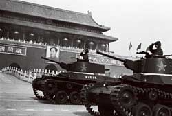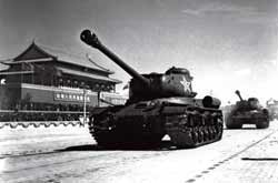 朱德總司令由聶榮臻司令員陪同乘車檢閱陸?杖。分列式開始后,戰(zhàn)車方隊約在3點(diǎn)半發(fā)動車輛,并以嚴(yán)整的隊形和每小時15公里的速度通過天安門,接受檢閱。一百多輛戰(zhàn)車通過天安門時,恰與空中戰(zhàn)鷹編隊同步,場面顯得恢宏壯觀,大氣磅礴。