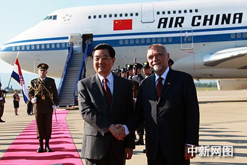 克羅地亞總統(tǒng)梅西奇親自到機場迎接,身著民族服裝的克羅地亞少年兒童向胡錦濤主席獻上美麗的鮮花,儀仗隊列隊向中國貴賓致敬。中國駐克大使吳連起率使館工作人員、中資機構和留學生和華人華僑代表到機場歡迎胡錦濤主席。