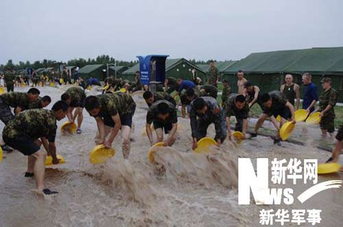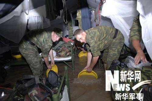 7月19日17時(shí)45分,中俄聯(lián)合軍演野營(yíng)村突遭強(qiáng)風(fēng)暴雨襲擊,降水量達(dá)47毫米,最大風(fēng)力9級(jí), 15分鐘路面積水即達(dá)10厘米,最深處達(dá)25厘米,中俄參演部隊(duì)多頂帳篷進(jìn)水。野營(yíng)村緊急啟動(dòng)應(yīng)急預(yù)案,組織中俄兩軍參演官兵共同排水。當(dāng)晚20時(shí),經(jīng)中俄雙方官兵全力奮戰(zhàn),營(yíng)區(qū)和帳篷大面積積水排除,被水淋濕的被服被更換(郭良生)