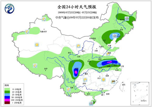 中新網(wǎng)7月22日電 中央氣象臺2009年7月22日06時發(fā)布未來三天天氣趨勢預(yù)報稱,江淮黃淮四川盆地江南北部等地有強降水,江南華南西南地區(qū)東部等地仍有高溫。