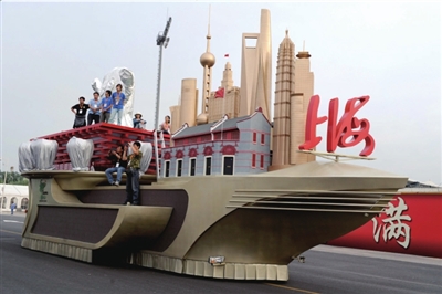張偉斌說(shuō),北京的彩車旨在突出“人文、科技、綠色”三大主題,彩車周圍是故宮的圍墻,加以紅色的飄帶和綠色的彩飾,前端是天壇的微型建筑,中間是一個(gè)轉(zhuǎn)盤,尾端是鳥巢和水立方的結(jié)合。