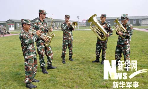 進(jìn)駐閱兵村后,為豐富官兵文化生活需要,方隊緊急組建了這支小型軍樂隊,配備了大小號、長圓號、大小軍鼓等各種管弦和打擊樂器。雖然樂隊成員只有10人,卻個個藝精才高。他們有的畢業(yè)于藝術(shù)學(xué)校,民樂、西洋管樂樣樣皆通;有的來自嗩吶世家,"童子功"相當(dāng)深厚;還有的是國家一級演員的弟子,快板說得頭頭是道……個個都是方隊的文藝骨干。這支軍樂隊也成了方隊的文藝演出小分隊。