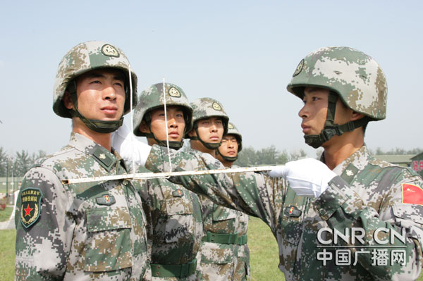 “向右擺頭45度,帽檐前緣與眉同高!薄皟赡_分開60度,向前踢腿時(shí),腳掌距離地面60厘米!薄跋蛴铱吹降卓词裁吹胤健边@組看起來枯燥乏味的數(shù)字 、簡(jiǎn)單易學(xué)的動(dòng)作,卻并不容易精確掌握做到,并直接影響著閱兵訓(xùn)練的全局(方隊(duì)的整齊一致)。