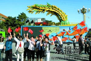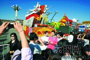 今天上午8時(shí)30分,60臺國慶彩車在天安門廣場亮相,開始進(jìn)行為期6天的集中展示,開放時(shí)間比原計(jì)劃提前了一個(gè)半小時(shí)。在兩小時(shí)時(shí)間內(nèi),數(shù)萬市民和游客涌入廣場參觀,爭相與彩車合影,國慶彩車當(dāng)之無愧地成為今天的廣場明星。