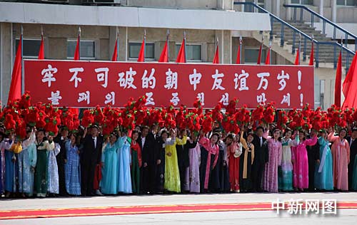 溫家寶一行乘車前往平壤市區(qū)途中,數(shù)十萬平壤市民身著節(jié)日盛裝,揮舞中朝兩國國旗、花束和標語,高呼中朝友好口號,夾道歡迎。溫家寶在金英日陪同下,站在敞篷汽車上向歡迎群眾揮手致意,并多次下車,與他們握手。車隊途經(jīng)平壤凱旋門時,朝鮮少先隊員向溫家寶敬獻鮮花,并給溫家寶系上紅領(lǐng)巾。