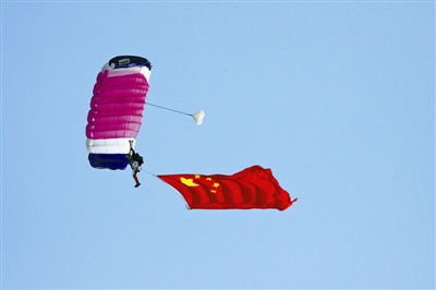 這次慶典表演,24名跳傘隊(duì)員將棄用慢速定點(diǎn)傘,首次使用造型傘。這種傘水平速度大,前進(jìn)速度達(dá)到每秒16米,對跳傘隊(duì)員心理素質(zhì)、駕馭能力和表演技巧是極大的考驗(yàn)。