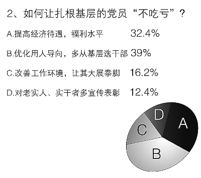 基層比較艱苦,基層比較復(fù)雜,被問到“如何讓扎根基層的共產(chǎn)黨員‘吃苦不吃虧’?”時,39%的受訪者更關(guān)注用人導(dǎo)向問題,他們認為應(yīng)該優(yōu)化用人導(dǎo)向,多從基層選拔領(lǐng)導(dǎo)干部;選擇提高經(jīng)濟待遇,福利水平的也占到了32.4%;值得注意的是,“更重視基層,改善工作環(huán)境,讓其大展拳腳”也受到關(guān)注,有16.2%的受訪者選擇了該選項。
