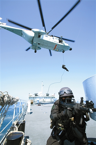 “報(bào)告!發(fā)現(xiàn)疑似海盜船尾隨商船船隊(duì)!”航行在亞丁灣海域的海軍第四批護(hù)航編隊(duì)迅即進(jìn)入一級(jí)反海盜部署:海軍特戰(zhàn)隊(duì)員奉命隨船護(hù)衛(wèi),直升機(jī)飛臨商船上空懸停,4名特戰(zhàn)隊(duì)員敏捷地滑降到商船上,進(jìn)入高度戒備狀態(tài)。