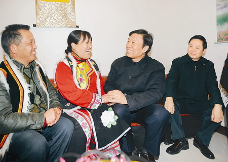 李源潮一下火車(chē),就與同來(lái)慰問(wèn)的省委書(shū)記、省人大常委會(huì)主任劉奇葆一起直奔北川縣看望災(zāi)區(qū)群眾,來(lái)到剛剛重建起來(lái)的擂鼓鎮(zhèn)吉娜羌寨。在地震中羌族同胞劉賢惠失去了丈夫、王孝萬(wàn)失去了妻子,在當(dāng)?shù)攸h委政府的關(guān)心下,他倆災(zāi)后組成了新家庭,住上了新房子,找到了新產(chǎn)業(yè),過(guò)上了新生活,有了新希望。劉賢惠緊緊拉著李源潮的手說(shuō):“感謝黨、感謝政府!全靠黨的政策好,讓我們?yōu)暮筮^(guò)上了好日子!”李源潮祝愿他們白頭偕老,日子越過(guò)越好。