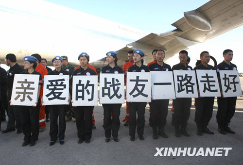 一切安排停當,人群自發(fā)聚攏過來,列隊送行。隊員們手中托著“親愛的戰(zhàn)友一路走好”的牌子,表情凝重,注視著飛機在跑道上緩緩滑行。