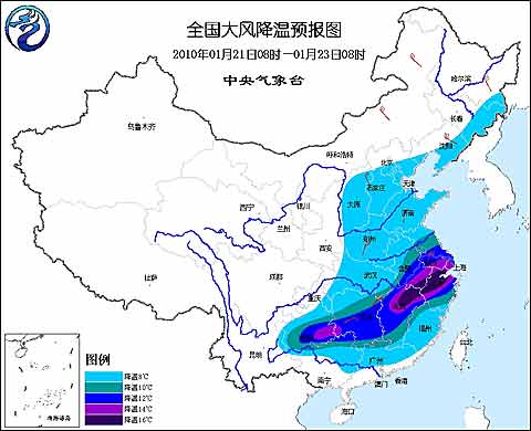 21日08時(shí)至23日08時(shí),華北中南部、東北東南部、黃淮、江淮、江漢、江南等地將先后有4~6級(jí)、陣風(fēng)7級(jí)偏北風(fēng);上述地區(qū)及華南北部、貴州等地的氣溫將下降8~10℃,其中,江淮南部、江南北部、貴州東部等地降溫幅度可達(dá)12~14℃,局部地區(qū)降溫達(dá)14~16℃。22日早晨,內(nèi)蒙古東北部、東北地區(qū)中北部的最低氣溫將達(dá)零下30至零下35℃,局地零下40℃;華北中南部、山東等地最低氣溫在零下9至零下14℃,黃淮南部和西部最低氣溫在零下4至零下6℃,江淮、江南北部最低氣溫在零下3至0℃。
