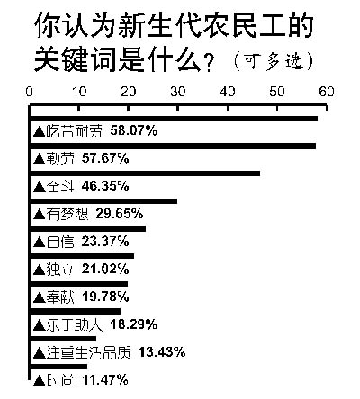 雖然專家指出,新生代農(nóng)民工具有“三高一低”的特征,即受教育程度高,職業(yè)期望值高,物質(zhì)和精神享受要求高,工作耐受力低。但本次調(diào)查中,當(dāng)問(wèn)到新生代農(nóng)民工的關(guān)鍵詞,“吃苦耐勞”仍以58.1%的支持率排名第一,“勤勞”以57.7%的支持率緊隨其后,排在第三位的是“奮斗”(46.4%)。
