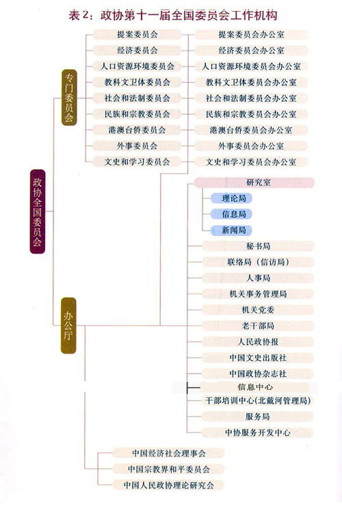 全國委員會設(shè)辦公廳,在秘書長領(lǐng)導(dǎo)下進(jìn)行工作;設(shè)副秘書長若干人,協(xié)助秘書長進(jìn)行工作。政協(xié)第十一屆全國委員會工作機(jī)構(gòu)如表2。
