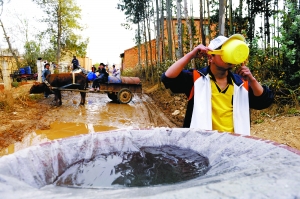 芳華鎮(zhèn)雙合村口,朱家付牽著牛車擠在人群中。黃牛拉著一個(gè)銹跡斑斑的鐵桶,那是全家用水的希望。抽上來的水不時(shí)的灑到人們身上,孩子們嬉笑著。