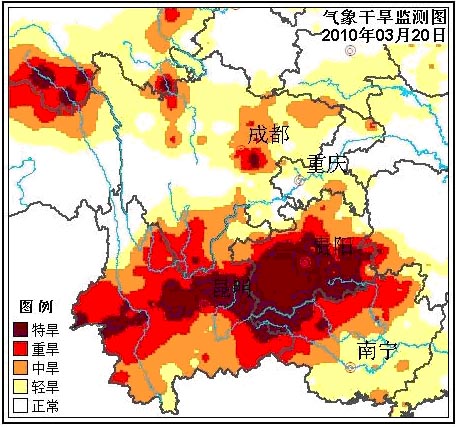 中新網(wǎng)3月21日電 綜合報道,目前,云南、廣西、貴州、四川、重慶五省區(qū)市旱情加劇。據(jù)統(tǒng)計,干旱受災人口達到5000多萬人,1600萬人飲水困難。旱情對農(nóng)業(yè)生產(chǎn)造成的影響已向上游市場傳導。中央氣象臺繼續(xù)發(fā)布干旱黃色預警:23日,貴州中東部有小雨或陣雨;未來三天,云南、川西高原南部、廣西西北部等旱區(qū)基本無降水,云南、貴州、川西高原南部、廣西西北部等氣象干旱區(qū)旱情將持續(xù)或發(fā)展。