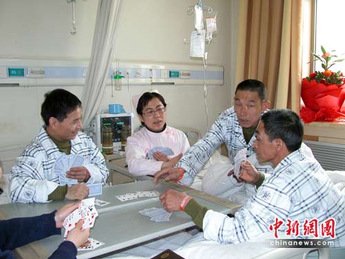 山大一院綜合科17病室里,正在拖拉機大戰(zhàn),65床的李先寶和67床的呂水江是撲克牌游戲中的一家,67床護士寧婷婷和66床護士王曉江是一家。