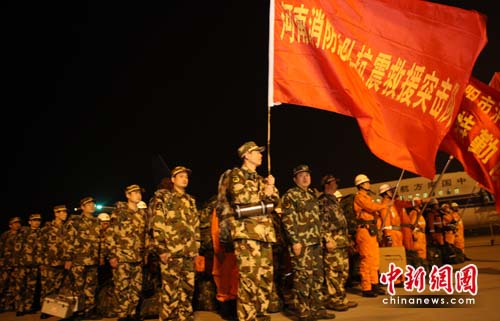 中新網(wǎng)4月15日電(王登峰 王志軍)今日凌晨3時(shí),按照公安部命令,河南省消防總隊(duì)跨區(qū)域應(yīng)急救援隊(duì)在總隊(duì)長夏夕嵐帶領(lǐng)下,從鄭州市新鄭機(jī)場(chǎng)乘飛機(jī)趕赴青海玉樹縣災(zāi)區(qū)抗震救災(zāi)。