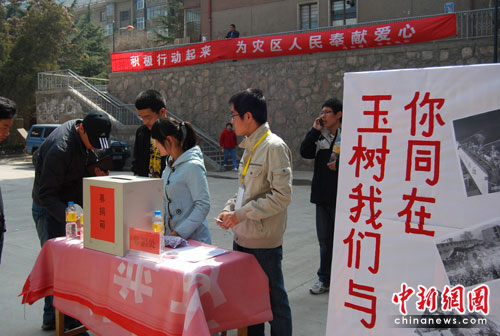 青海省玉樹縣發(fā)生強烈地震后,震區(qū)的災(zāi)情時刻牽動著與青海情同手足的鄰居——甘肅。15日,西北民族大學發(fā)起了“援助青海玉樹災(zāi)區(qū)”活動,多個民族的學生為災(zāi)區(qū)同胞奉獻自己的綿薄之力。