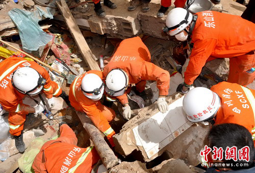 當(dāng)天9時(shí)20分許,四川消防總隊(duì)第三批攻堅(jiān)集訓(xùn)的鐵軍其中一搜救分隊(duì)在扎西巷一藏族居民區(qū)展開搜救時(shí)生命探測儀突然有了“反應(yīng)”, 通過詢問當(dāng)?shù)鼐用竦弥哼@棟半垮塌的三層居民樓內(nèi)確實(shí)還有四人在里面(初步認(rèn)定為兩對母子),但生死不明,并由于房屋損毀嚴(yán)重,其親屬也不知被埋人員的具體位置。雖經(jīng)反復(fù)搜索只能偶爾搜到非常微弱的“信號”,但隊(duì)員們?nèi)匀蝗φ归_搜救。