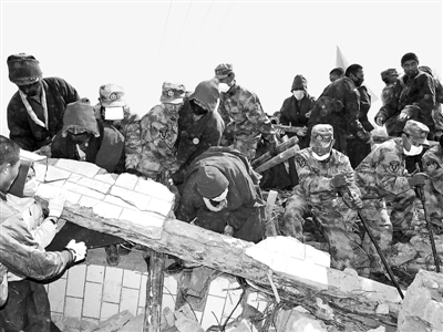 4月16日9時45分,青海省軍區(qū)某獨立步兵團2營官兵冒著斷壁隨時倒塌的危險,在結(jié)古鎮(zhèn)扎西達通街道的一片廢墟下,成功救出一名被廢墟埋壓49個小時的藏族婦女。