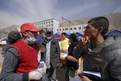 他的名字叫高樹友。在現(xiàn)場負責(zé)招募志愿者的玉樹團州委干事扎西告訴我,地震發(fā)生后幾小時,滿身是土的高樹友跑來了,找到我們要求當(dāng)志愿者。“當(dāng)時現(xiàn)場還很亂,我們隨便找了一張紙,高樹友寫下了第一個名字”,扎西從桌上拿出一個寫滿名字的紙說:“就是這樣的紙,現(xiàn)在已經(jīng)寫滿幾十頁,有400多人報名了,地震當(dāng)天有30多個。高樹友不僅是第一個報名,而且?guī)椭覀兘M織志愿者,這個招募點就是我們一起搭起來的!