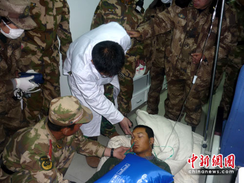 中新網4月21日電(劉洪星)武警青海總隊第四支隊某中隊戰(zhàn)士夏祥由于長時間超負荷的工作與20日16時30分暈倒在救災現場,后經診斷該戰(zhàn)士患上高原上最為可怕的肺水腫,生命垂危。