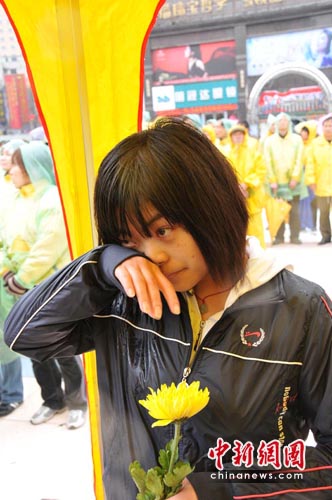 中新網(wǎng)鄭州4月21日電 (記者 晏立海)4月21日上午,鄭州市民手捧黃菊花匯集二七廣場(chǎng),在雨中默哀3分鐘,以悼念在青海玉樹(shù)地震中遇難的同胞。